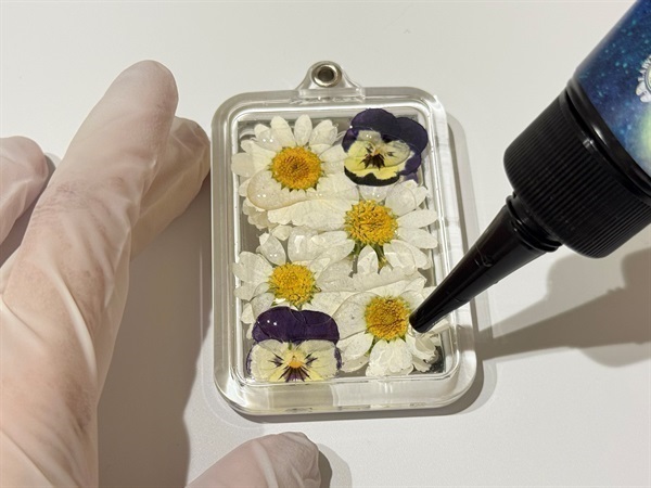 ◯ 万が一、レジン液が手などに付いた場合は、石鹸と流水では落ちにくいため、アルコールを含ませたティッシュ、またはレジンクリーナーで拭き取った後、十分に石鹸で洗い流してください。アレルギー症状が出た場合は、すぐに医療機関を受診してください。