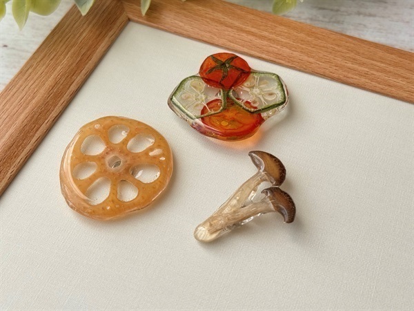 トマト・オクラ・しめじ・れんこんの押し花をレジンで包み、