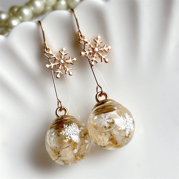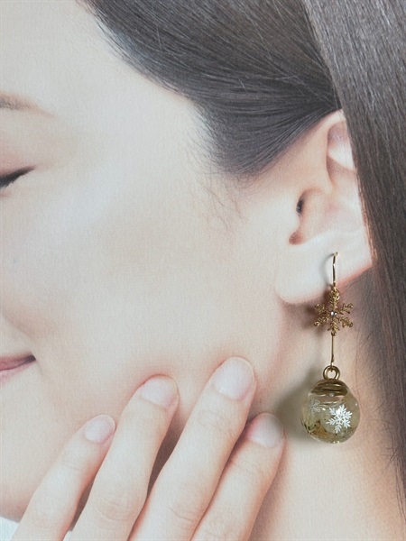 ガラスドームの中には、本物のかすみ草をオイルとともに閉じ込め、金箔やラメを散りばめて、雪景色のような世界を表現しています。動くたびにきらめくラメが舞い、耳元で小さな冬の物語が始まります。 本物のかすみ草をオイルの中に入れる事で、ふわふわした花びらが生き生きと感じられる作品です。オイルの中に入れた金箔やラメが、動くたびに揺らめき、美しく舞う雪景色を思わせてくれるアクセサリーです。