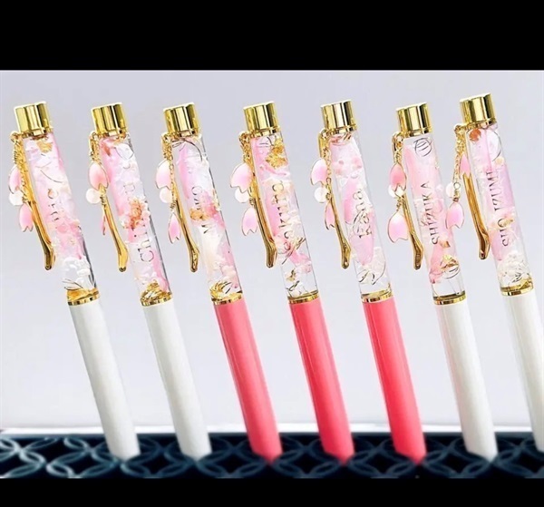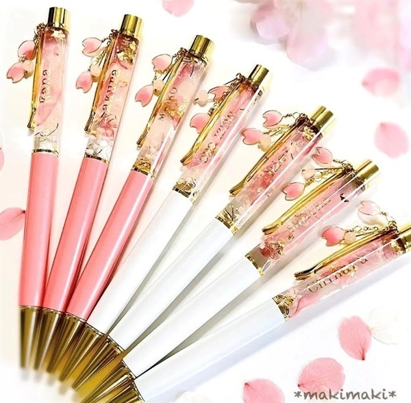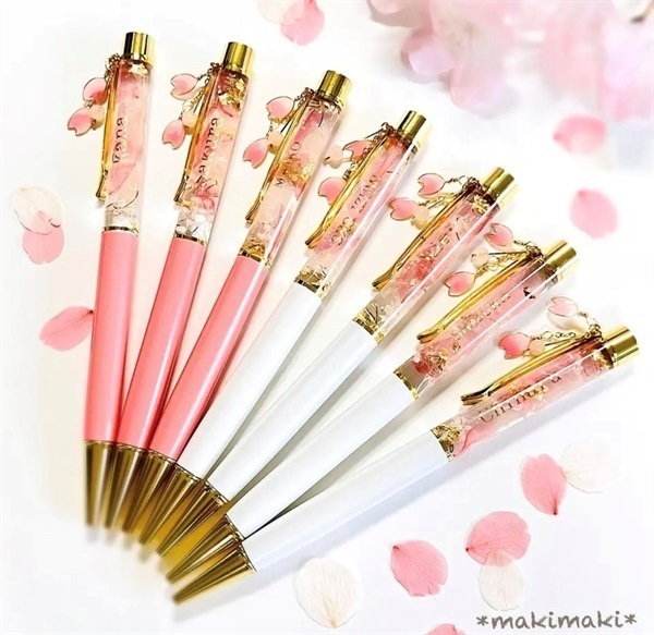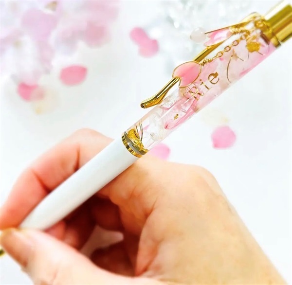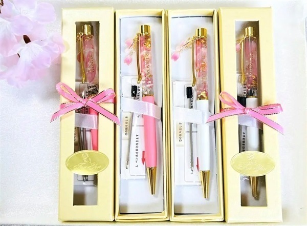 ソメイヨシノの花びらのプリザーブドフラワーを封入したハーバリウムボールペン。