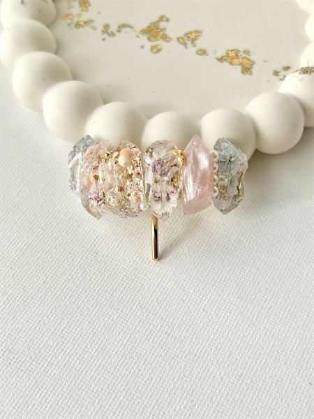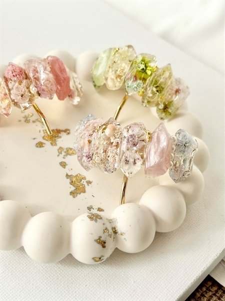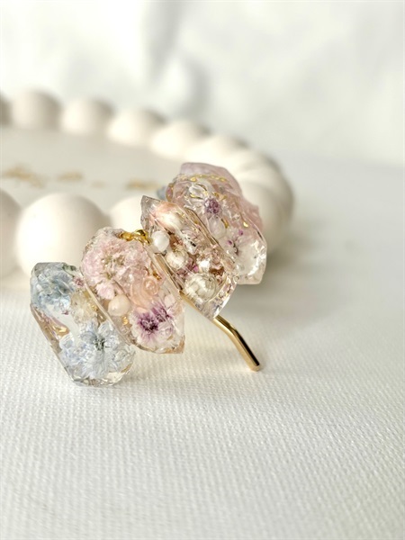 本物のお花を閉じ込めた、やさしい色合いの鉱石風ポニーフック。