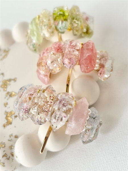 本物のお花を閉じ込めた、 鉱石のような透明感のポニーフックです。