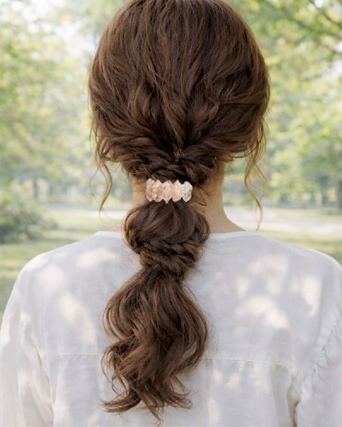 髪を結んだゴムに差し込むだけで、まとめ髪にさりげない華やかさを添えてくれます。