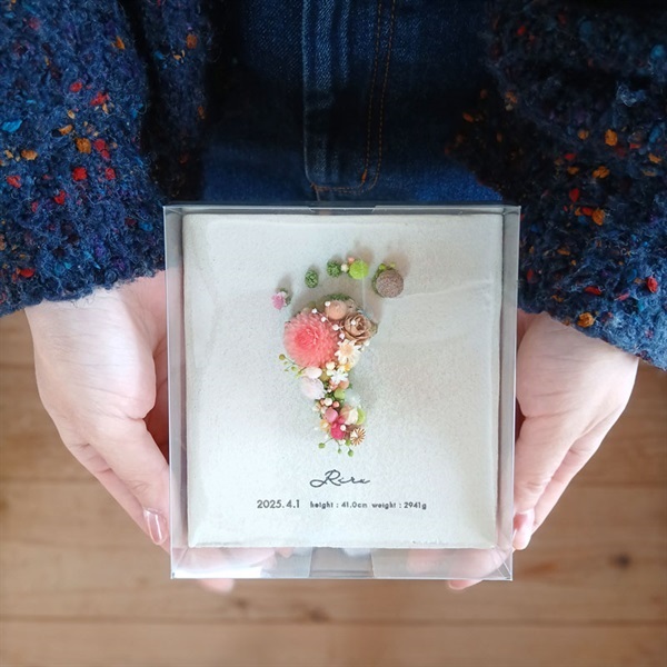 赤ちゃんの足型をボタニカルアートとして可愛く残しませんか? さまざまなドライフラワー、プリザーブドフラワーを使って足型それぞれのカタチをそのままお作りいたします!