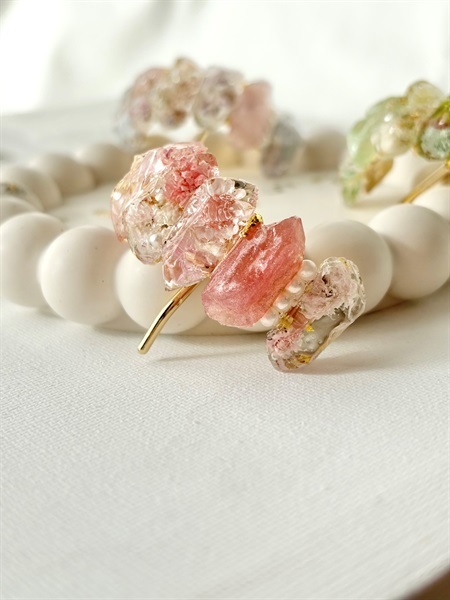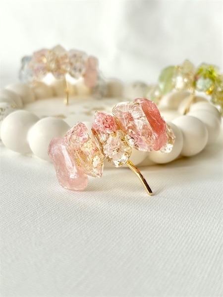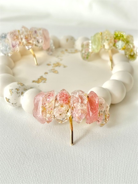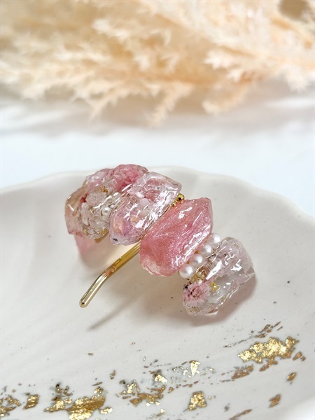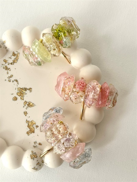本物のお花を閉じ込めた、鉱石のような透明感のポニーフック。