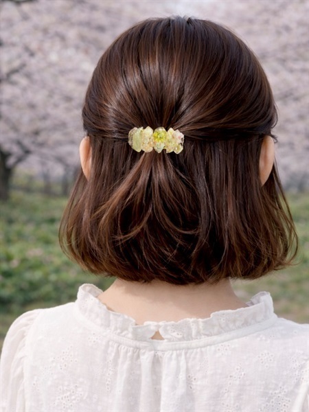 やわらかなグリーンが髪に自然になじみ、まとめ髪にさりげない華やかさを添えます。