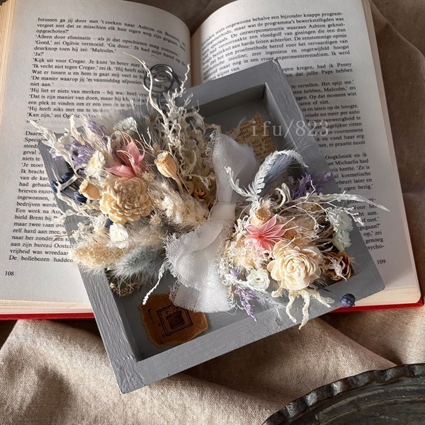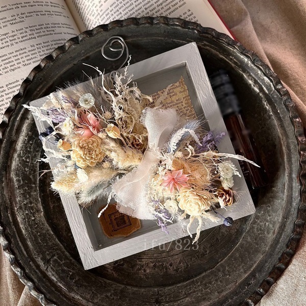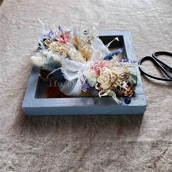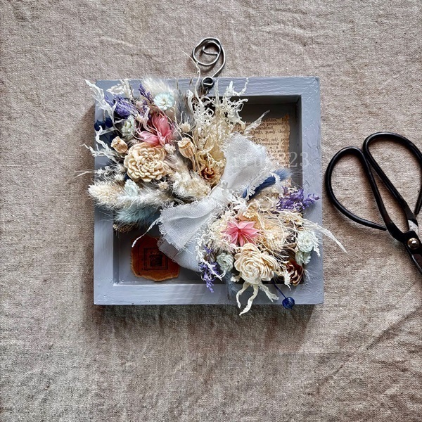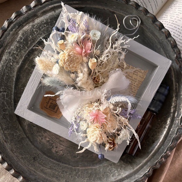 オリジナルな木枠を明るい色にし、小さいながらも華やかに。そばにいて癒してくれる。華やかだけど強調しない、”優しさを与えてくれる”そんなお花です。