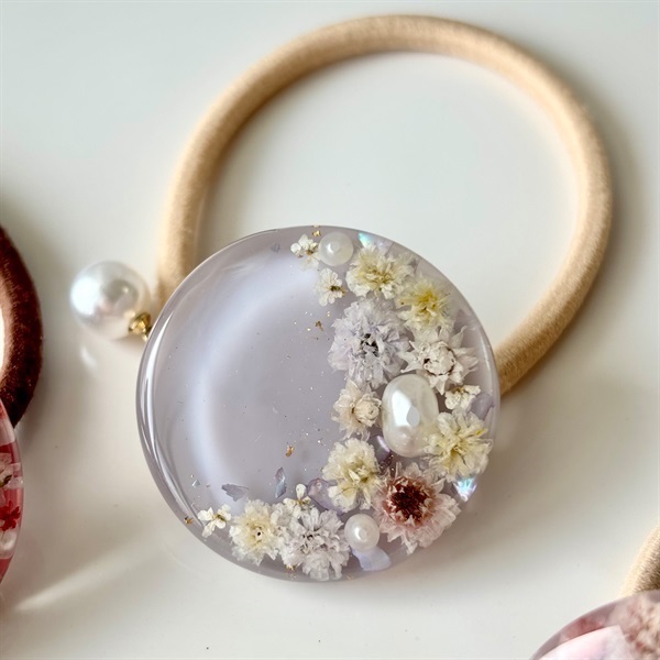 光を受けると、透明感のあるレジンの中で花や金箔が静かにきらめき、動くたびにやさしい表情を見せてくれます。