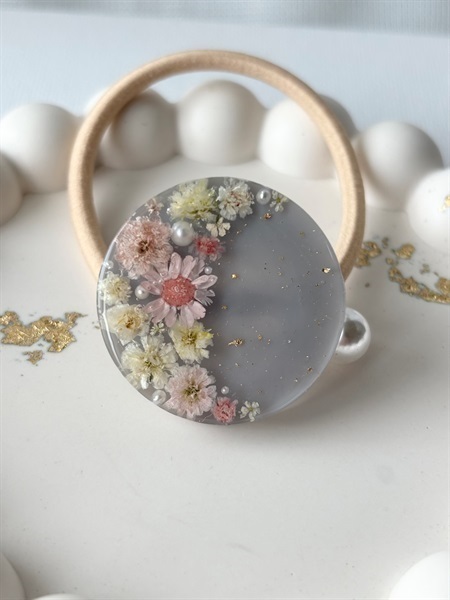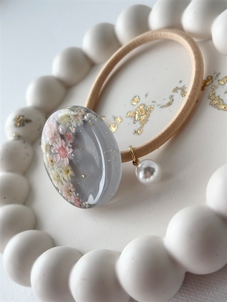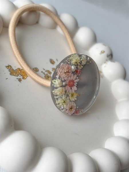 光を受けると、透明感のあるレジンの中で花や光が静かにきらめき、動くたびにやさしい表情を見せてくれます。