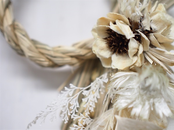 伝統的なしめ縄と、ドライフラワーのナチュラルスワッグ。
