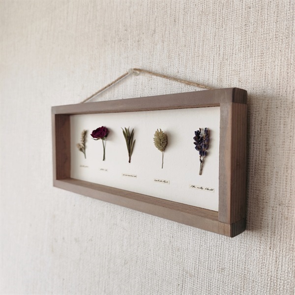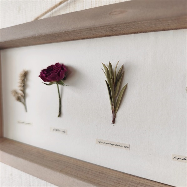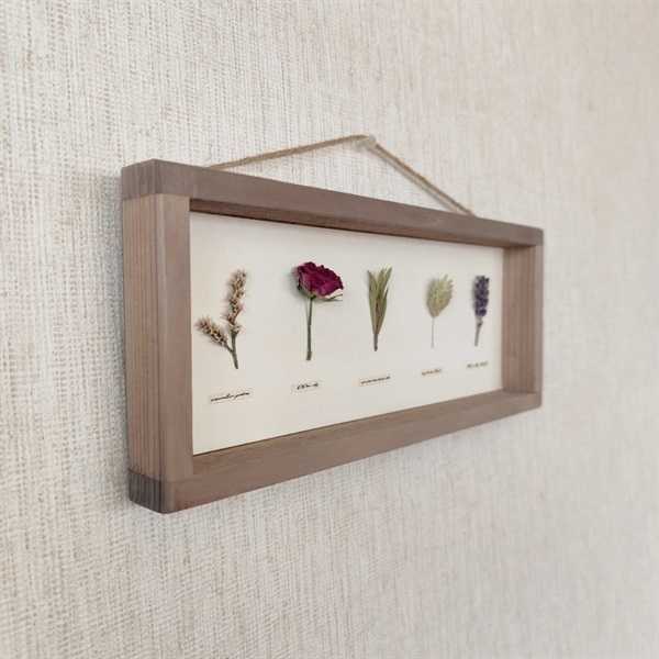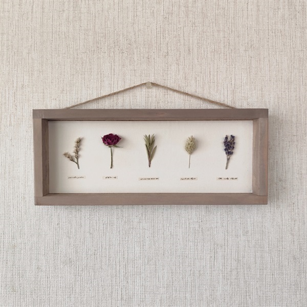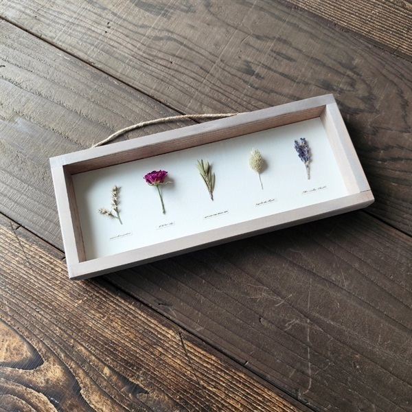このパネルは、私自身の手仕事で仕立てた古材風の額に、選び抜いたドライフラワーを標本のように配した一点ものです。