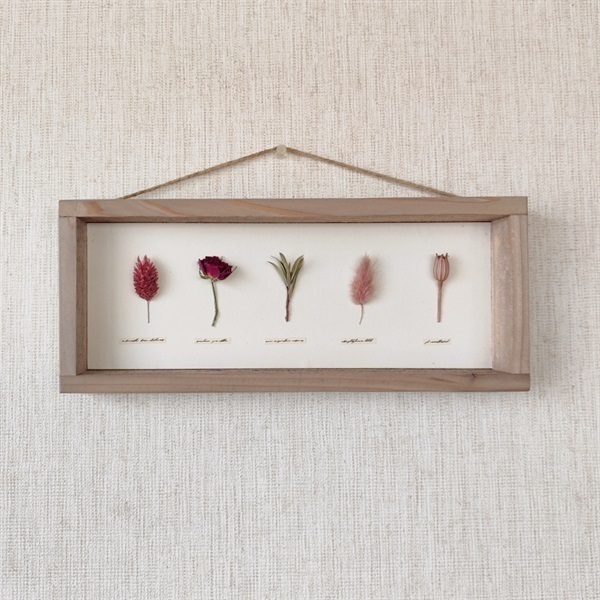 このパネルは、私自身の手仕事で仕立てた古材風の額に、選び抜いたドライフラワーを標本のように配した一点ものです。