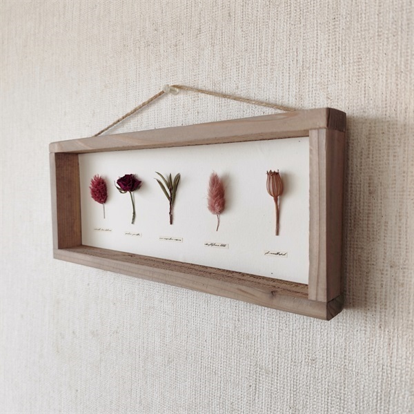 制作においては、植物本来の風合いや、時の経過とともに変化していく表情を大切にしています。自然の立体感と温かみをパネルという形に凝縮させることで、場所を選ばず日常の風景に彩りを添える作品を目指しています。
