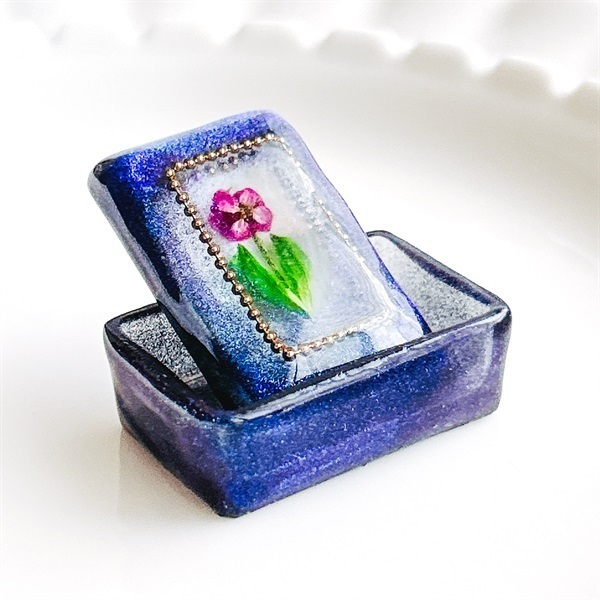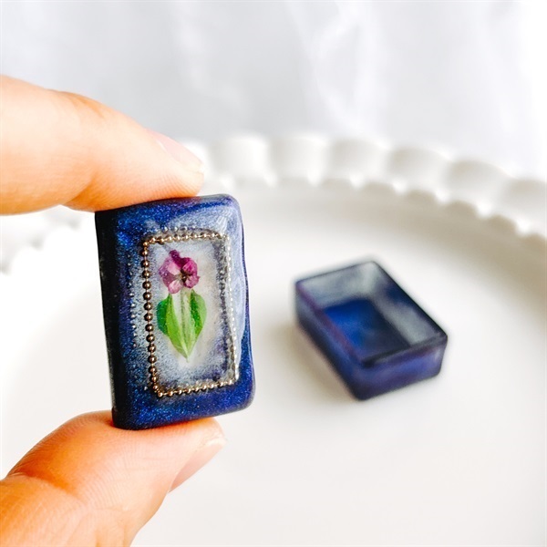 手のひらに収まる「花色箱」は、小さな箱の中にお花の景色を閉じ込めた作品です。