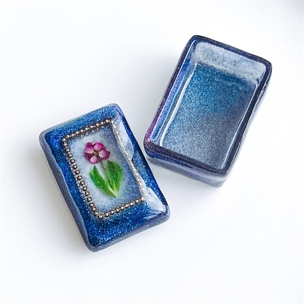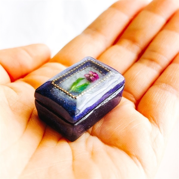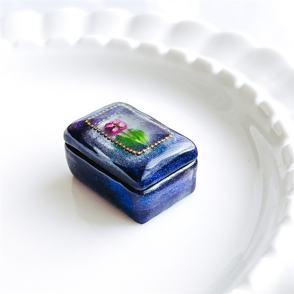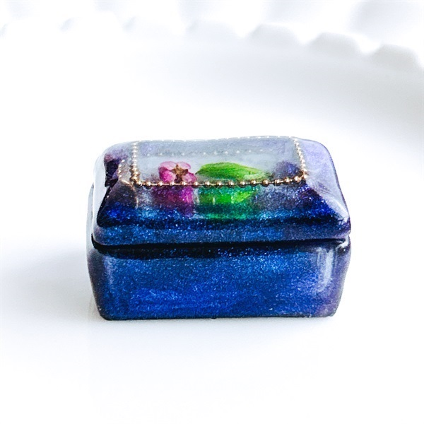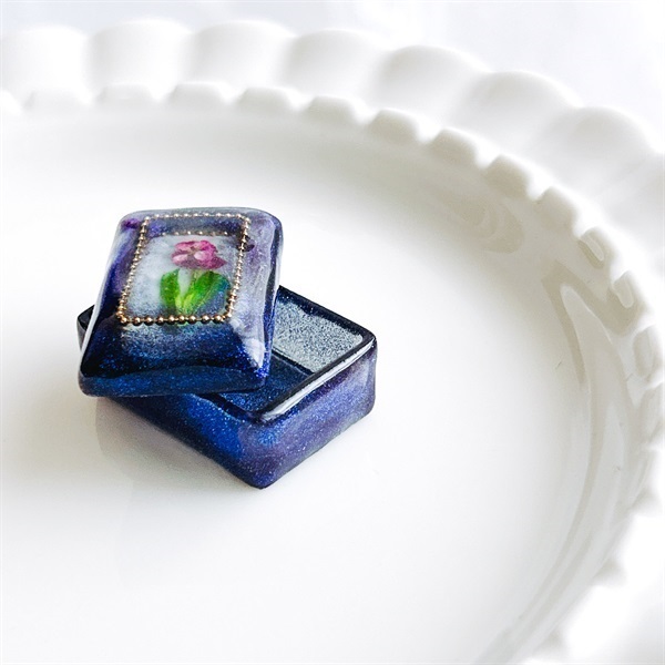 一輪の花を主役に、絵画のような静けさを意識して仕立てた花色箱です。透明感のある中に、凛とした佇まいが際立つよう、配置や色のバランスにこだわりました。偏光パウダーを使用しており、光の角度によって色合いが移ろい、奥行きのある幻想的な輝きをお楽しみいただけます。アンティークのような落ち着きと、空間にそっと溶け込む上品な存在感が魅力の、特別なひと箱です。