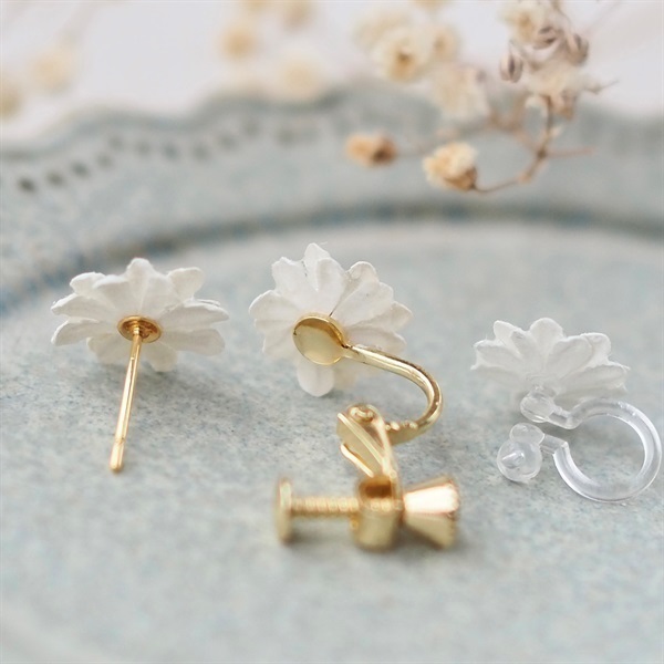 金具は金属アレルギーの方も安心な樹脂製金具(イヤリングのみ)を含めた3種類をご用意しています。