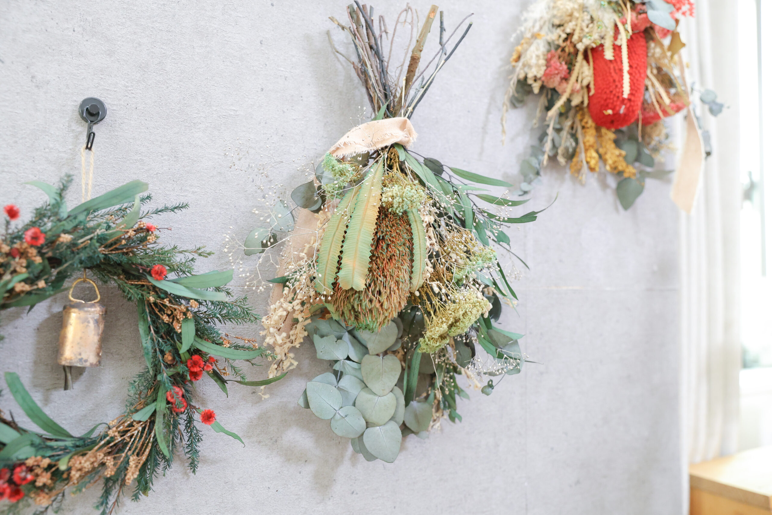 爽やかな香りのユーカリやワイルドフラワーのバンクシアを使ったスワッグは、お部屋の主役インテリアとしても楽しめます。