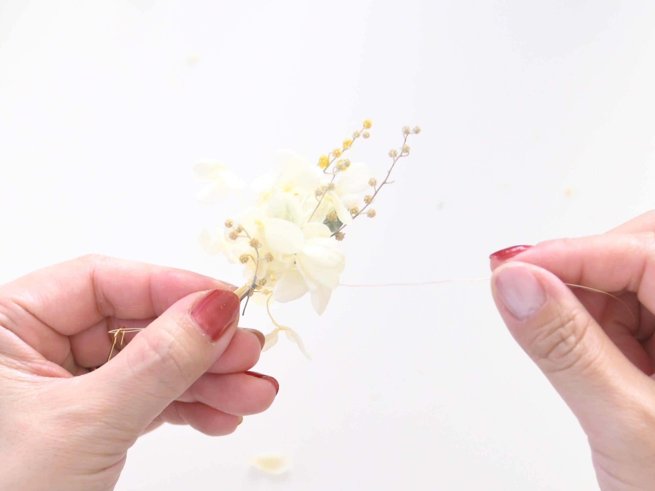 小さな花束1つだけワイヤーにクルっと留めて、続きはまた明日