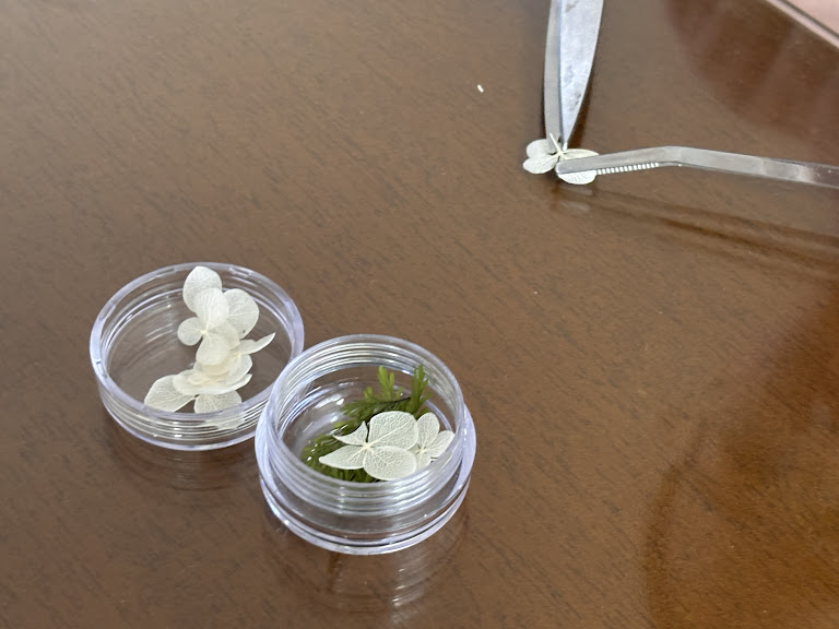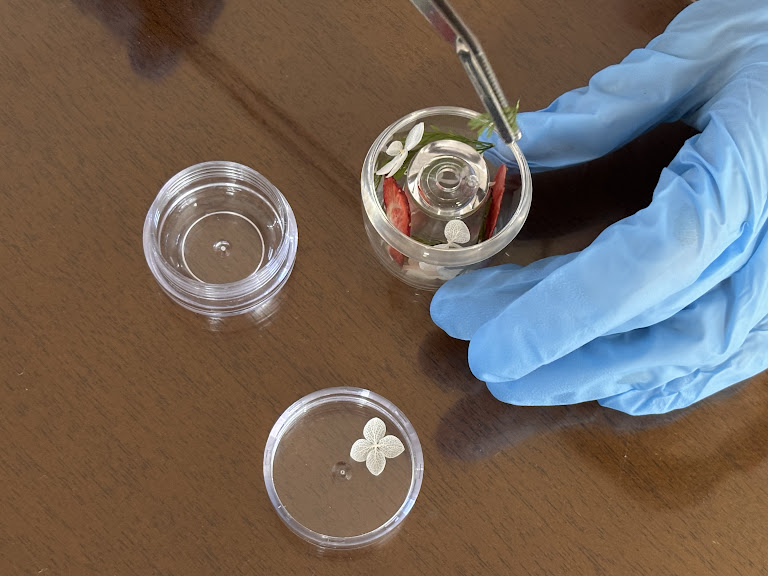 ピンセットで持ち上げると、儚げに陽に透ける白い紫陽花。