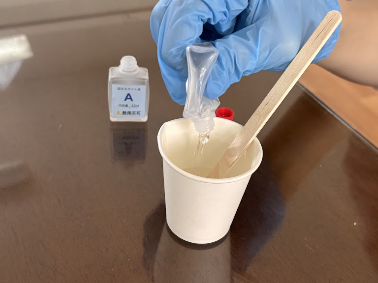 次は、紙コップにA液とB液を入れ、かき混ぜ棒で混ぜて混合液を作ります。