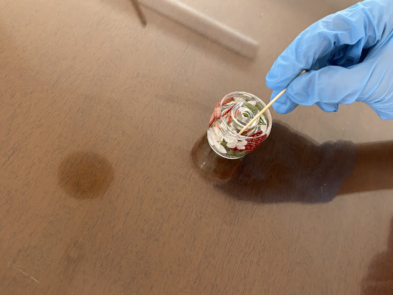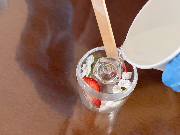 9割ほど注いだタイミングで、爪楊枝で花やグリーンの最終微調整をしました。
