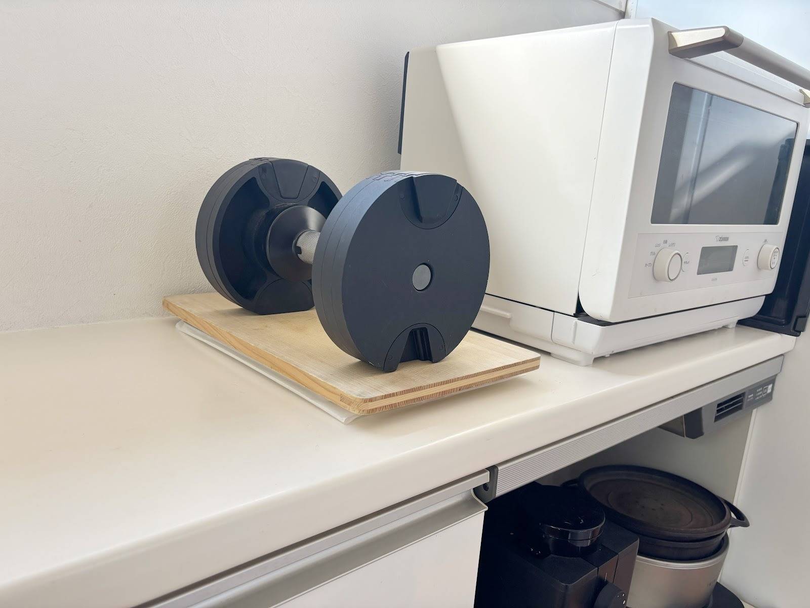 重しには夫のダンベルを採用しました。